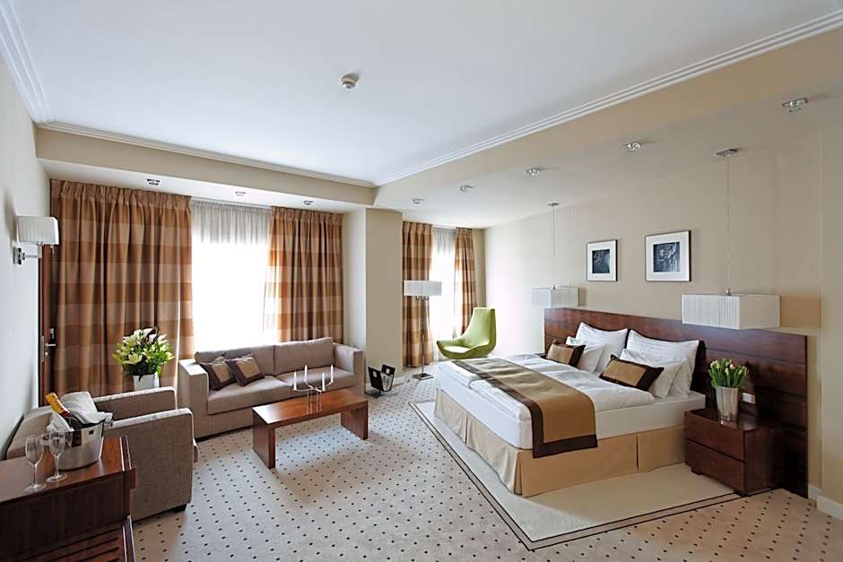 Features a separate living room with a comfortable sofa and armchair.